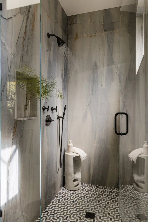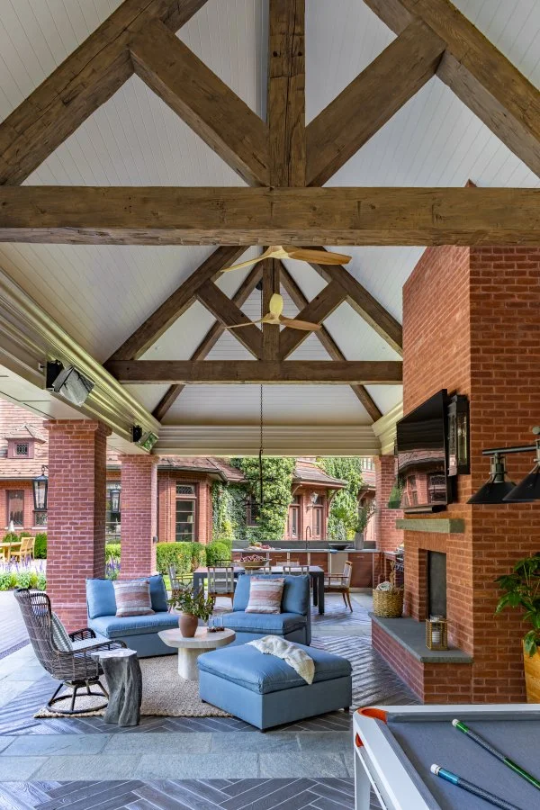 A natural extension of the home, this pool pavilion blends traditional architecture with modern comfort. Framed by brick columns and a cedar shake roof, the space opens to a lounge with a fireplace, outdoor kitchen, and views across the pool. Inside, warm wood tones, exposed trusses, and thoughtful details bring a sense of casual sophistication. With a sauna, full bath, laundry and outdoor shower, it’s a place designed for everyday retreat and effortless entertaining.
